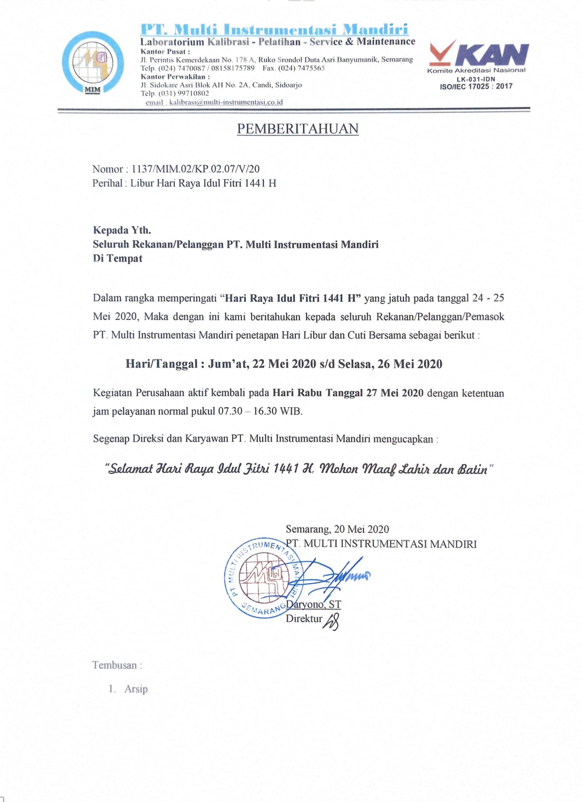 Selamat Hari Raya Idul Fitri 1 Syawal 1441 H kepada seluruh pelanggan PT Multi Instrumentasi Mandiri By admin|2020-05-21T06:54:24+07:00May 21st, 2020|Categories: Berita|Tags: Cuti Lebaran|0 Comments Share This Story, Choose Your Platform! FacebookXLinkedInTumblrPinterestEmail About the Author: admin Related Posts